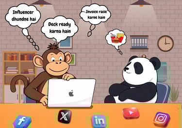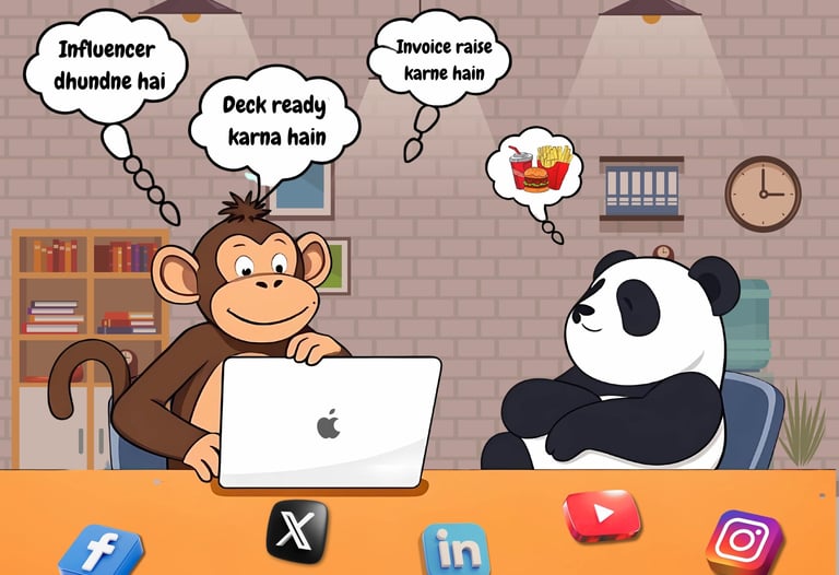 At The Lazy Panda & The Monkey, marketing isn’t just kaam for us—it’s an art of storytelling, creativity, and full-on masti! With the perfect mix of strategy, thodi si madness, and a whole lot of fun, we help brands connect with their audience in the most dhamakedar way. Jaise ek panda chill mode mein rehta hai but knows when to move, aur ek monkey full energy se action leta hai—waise hi hum bhi balance rakhte hain. Smart soch, effortless execution! Our name, The Lazy Panda & The Monkey Co., perfectly sums up our vibe —calm yet clever, playful yet powerful. Hum wahi karte hain jo zaroori hai, bina extra shor-sharabe ke, but with full impact!